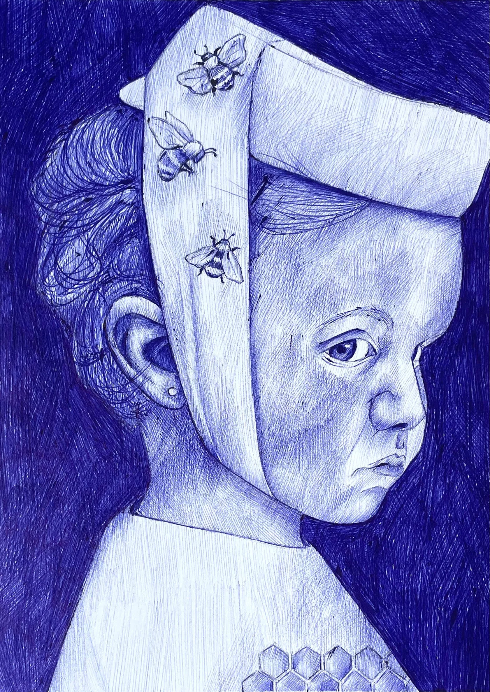 My ink drawings are made with a simple ballpoint pen, layering fine lines and cross-hatching to create depth and texture. Drawing this way feels natural to me, it's the one technique I truly love for drawing.
